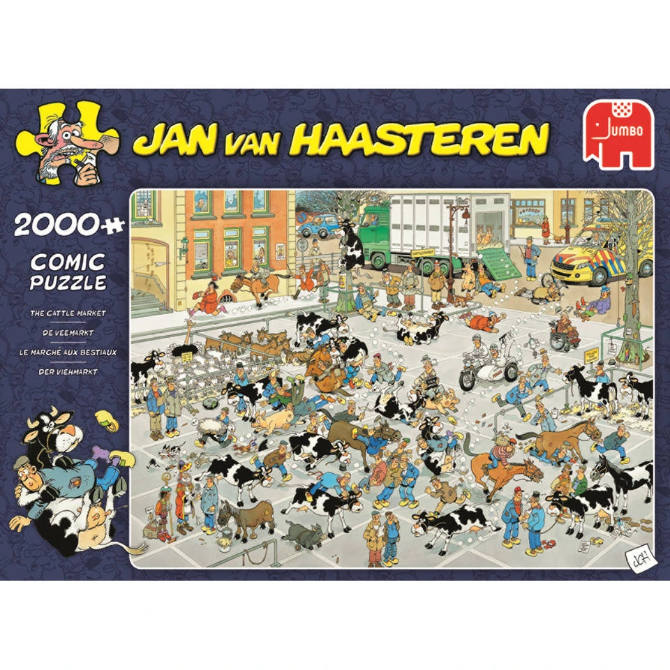 Deze Jumbo Jan van Haasteren puzzel neemt jou mee naar de veemarkt! Puzzel de stukjes aan elkaar en zie een prachtige afbeelding verschijnen van vreemde en leuke situaties die plaatsvinden op de markt. Deze schitterende Jumbo puzzel bestaat uit maar liefst 2000 stukjes.