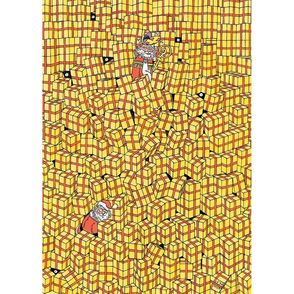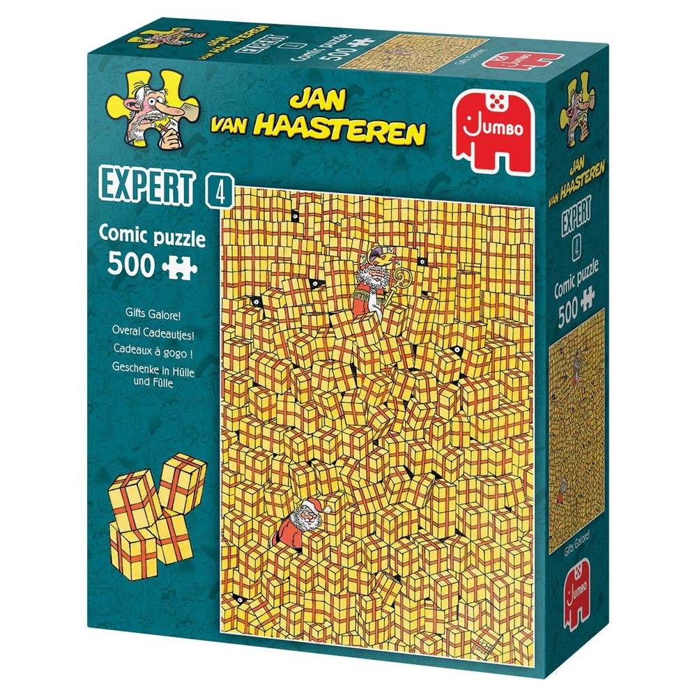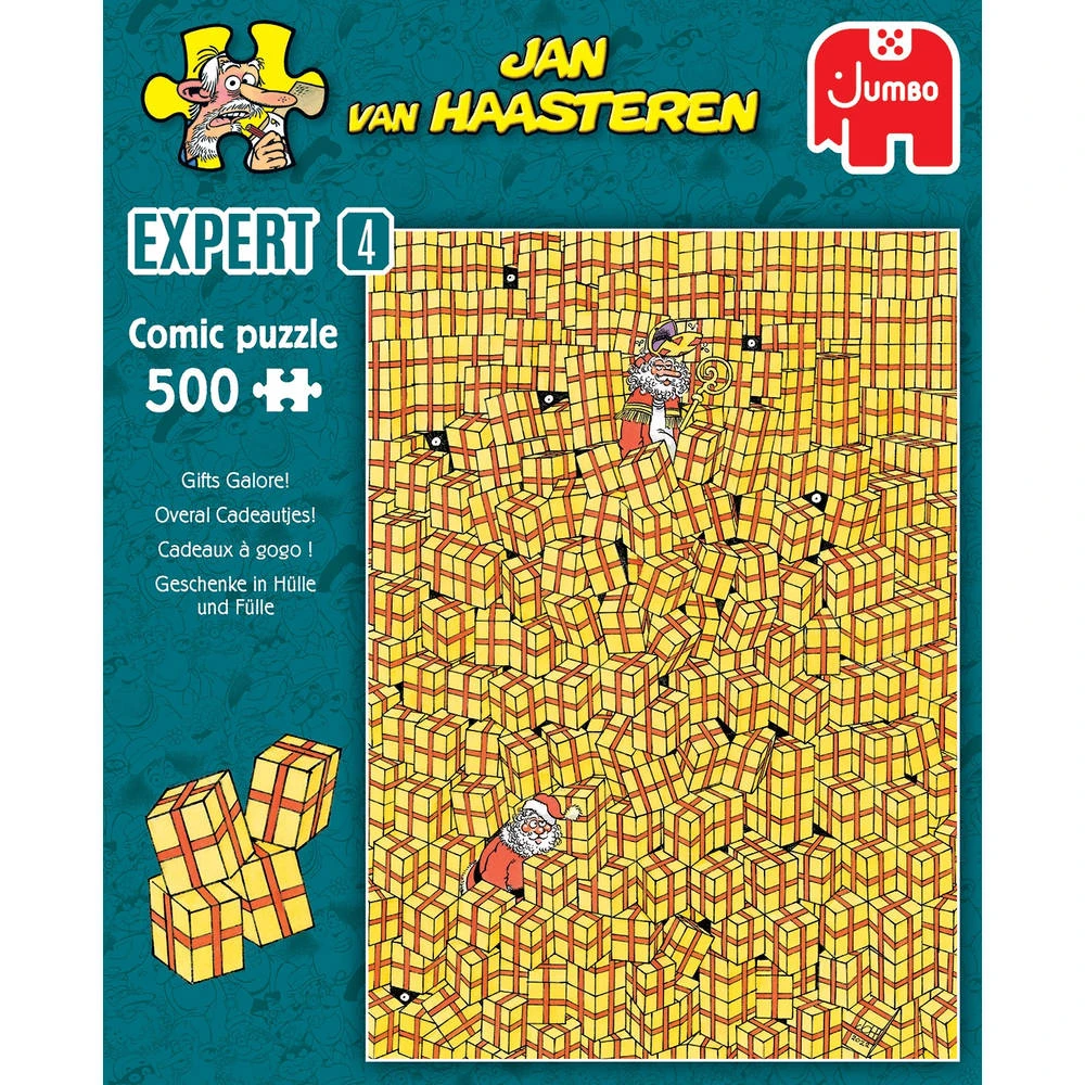 Leg de 500 stukjes van deze Jumbo Jan van Haasteren puzzel Expert 4: overal cadeautjes en ontdek en grappige cartoon vol kleurrijke cadeautjes.