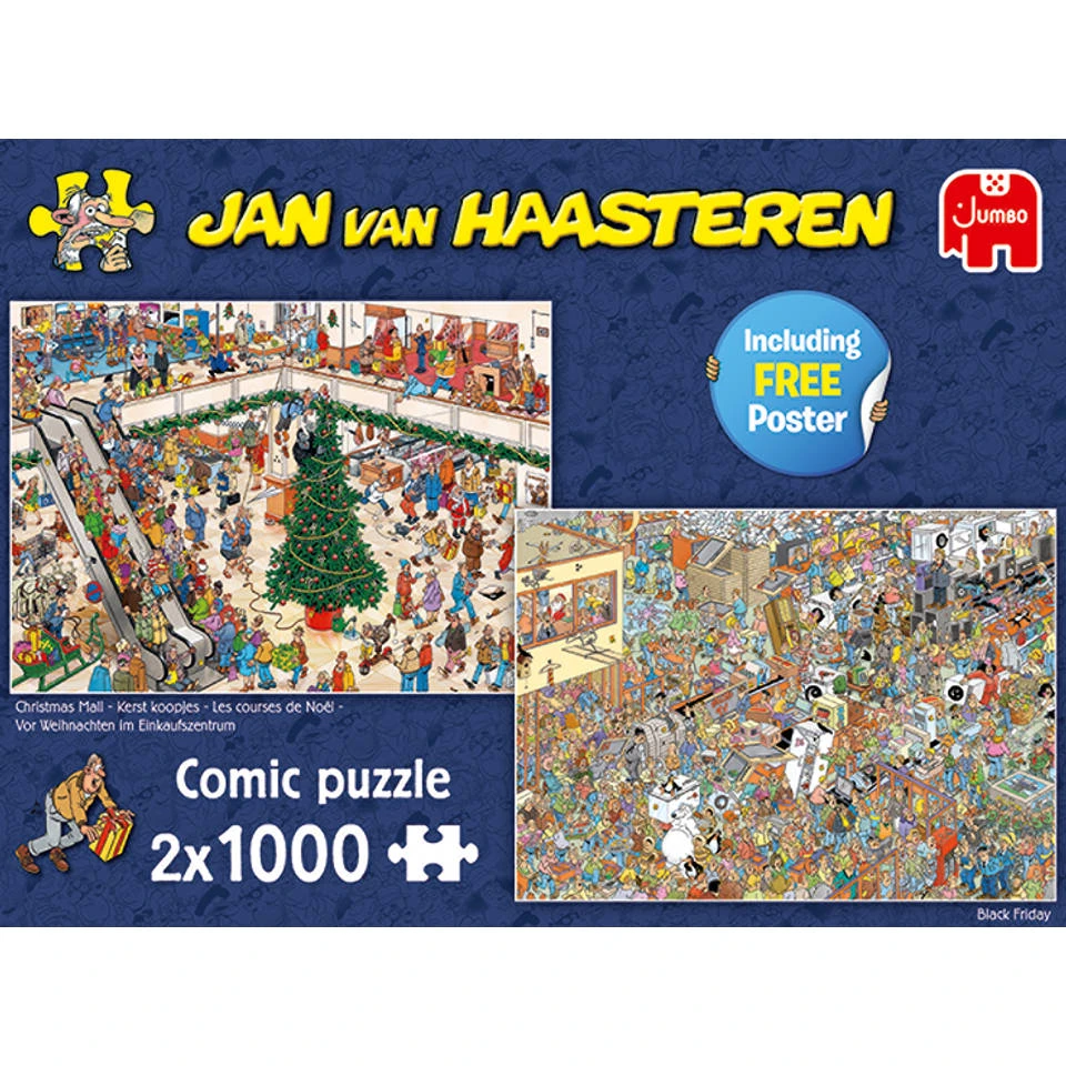 Met deze Jumbo Jan van Haasteren puzzel heb je dubbel puzzel plezier. Het thema voor de twee puzzels van 1000 stukjes is shoppen voor de feestdagen.
