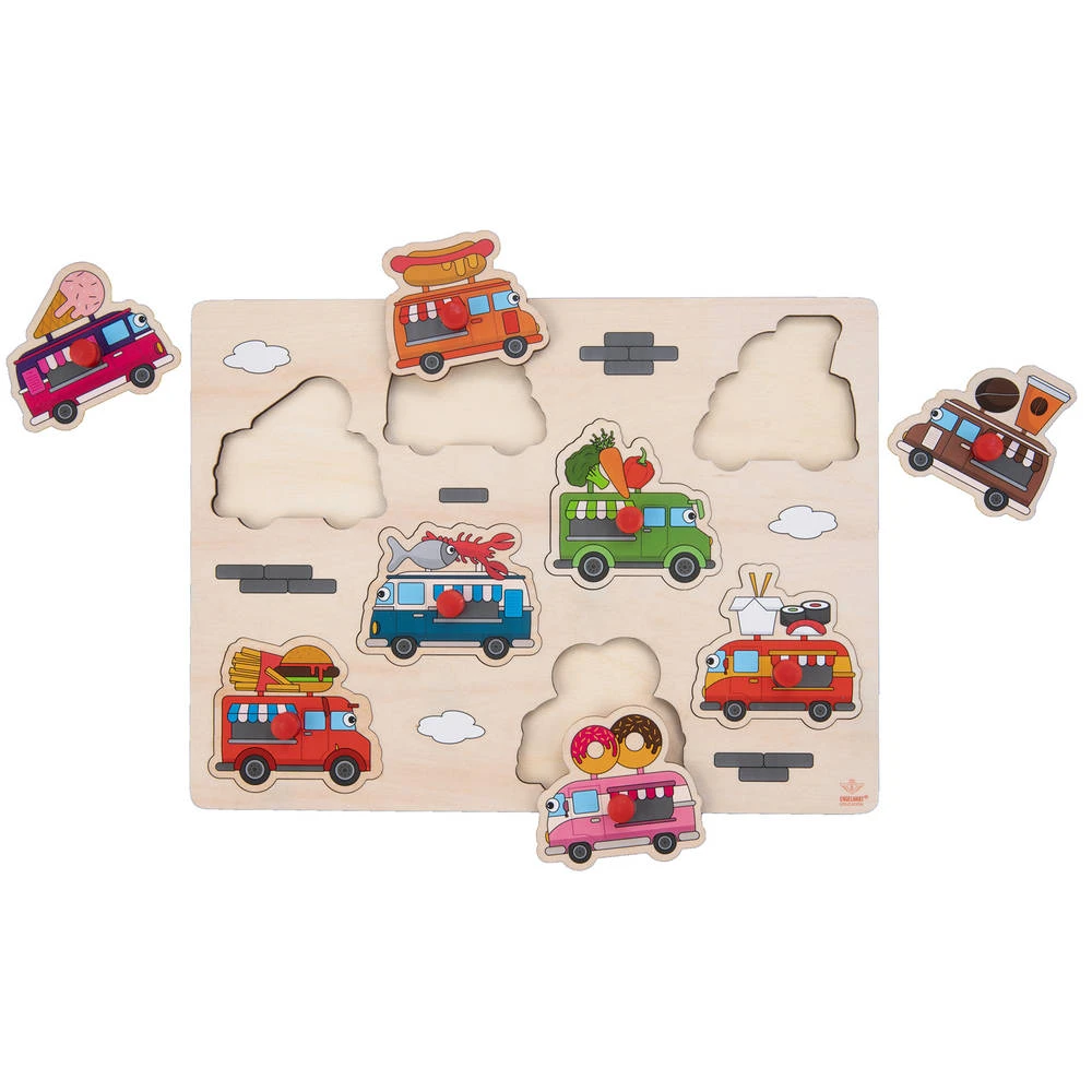 Kleine foodies zullen veel plezier beleven aan deze knopjespuzzel. Bij deze puzzel draait het allemaal om foodtrucks. Welke typen foodtrucks ken jij? De puzzel is van hout gemaakt.