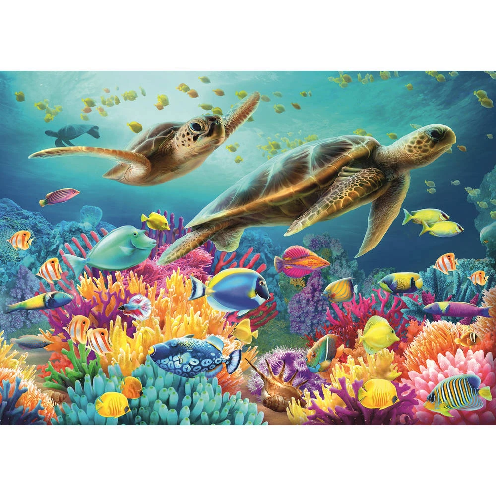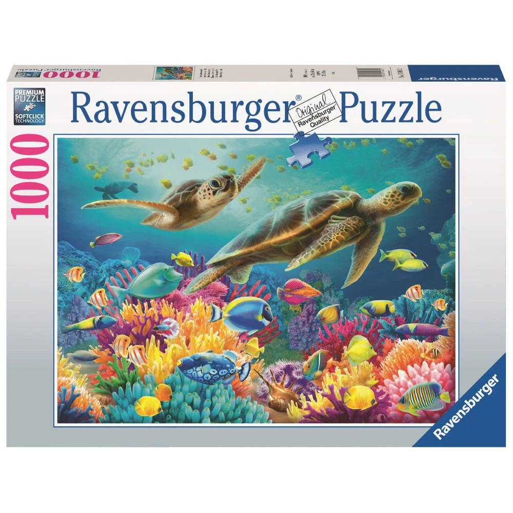 Ben je ook beniewd hoe de onderwaterwereld eruitziet? Dan zal je deze Ravensburger puzzel met plezier maken. Op de puzzel is een mooi plaatje van blauwe onderwaterwereld met schilpadden te zien. Omdat deze puzzel een standaardformaat heeft kun je het resultaat inlijsten en ophangen. Dankzij de met de hand gemaakte stansmessen is de vormvariatie van de stukjes oneindig. Jong en oud zullen genieten van deze puzzel van 1000 stukjes.