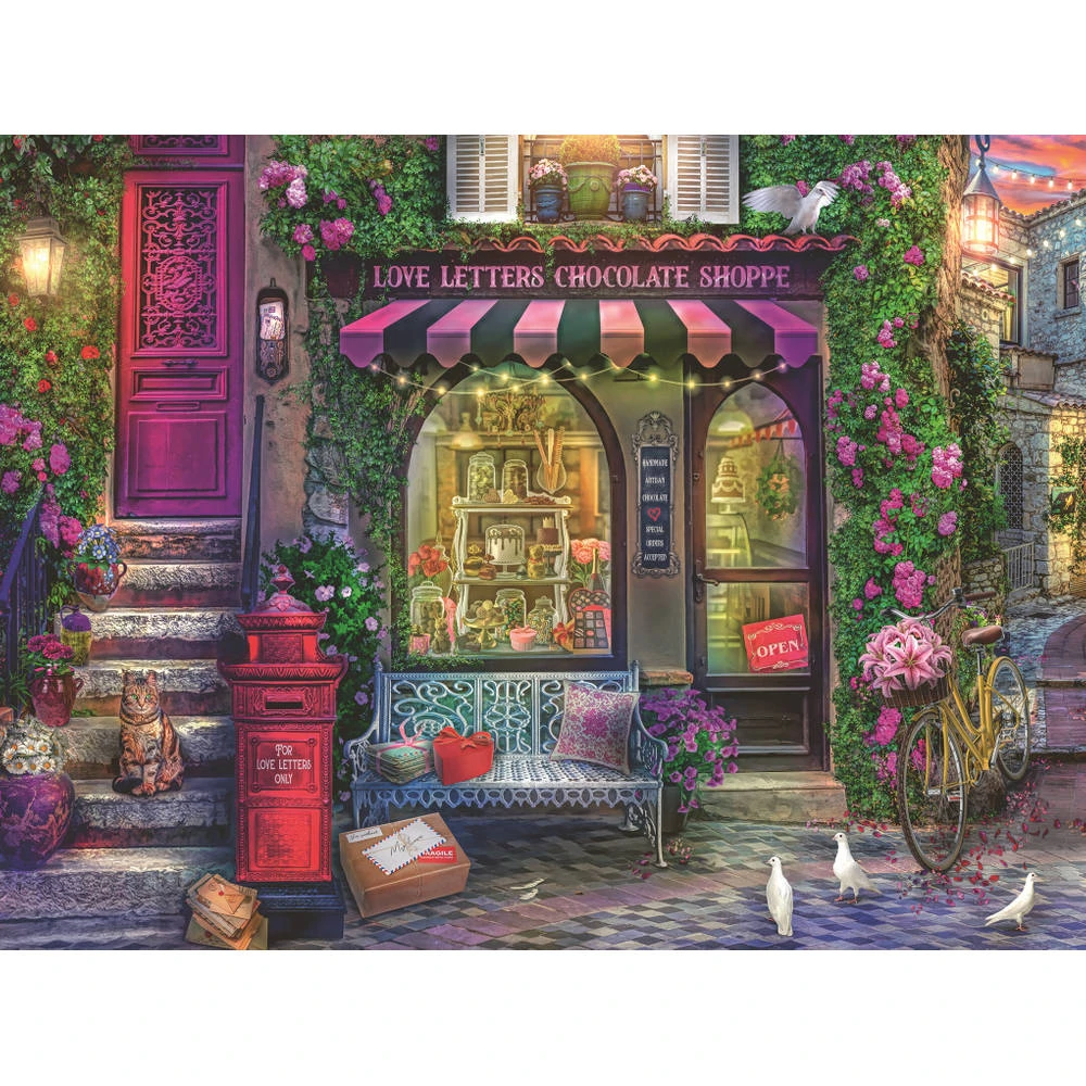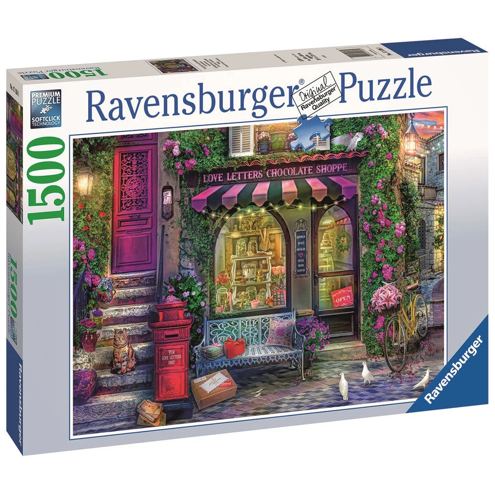 De Liefdesbrieven en chocoladeshop puzzel van Ravensburger bestaat uit 1500 stukjes. Leg de stukjes om de juiste plaats.